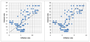 In theory, we can produce an equation that would fit absolutely any data set you like. I’ve done a rough illustration in the graphs here which both show SA interest rates and inflation over the last 12 years. The first is a simple linear regression of interest rates against inflation. The second is a regression but with six terms instead of two. The first fits the data pretty weakly while the second fits it much better.