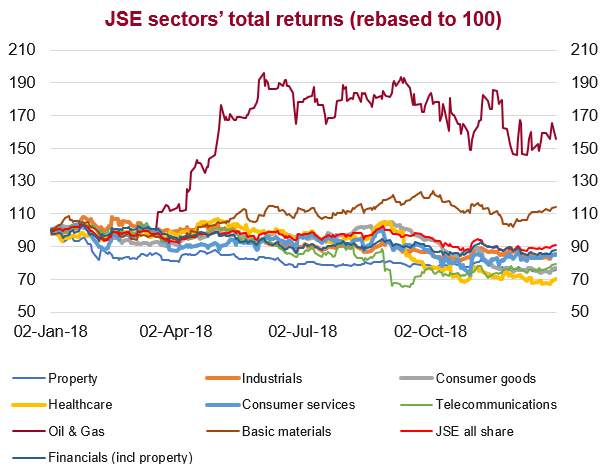Economic data released so far show the economy remains under pressure, although there are a few positives. Mining production fell by 6% for the first 11 months of 2018. Contrarily, November retail sales increased by 3.1%, indicating that black Friday sales performed better than last year, with household furniture and appliances leading the way, jumping 13.5%. However, recent trading updates by retailers Woolies and Mr Price have disappointed, dragging the sector down on the local bourse.